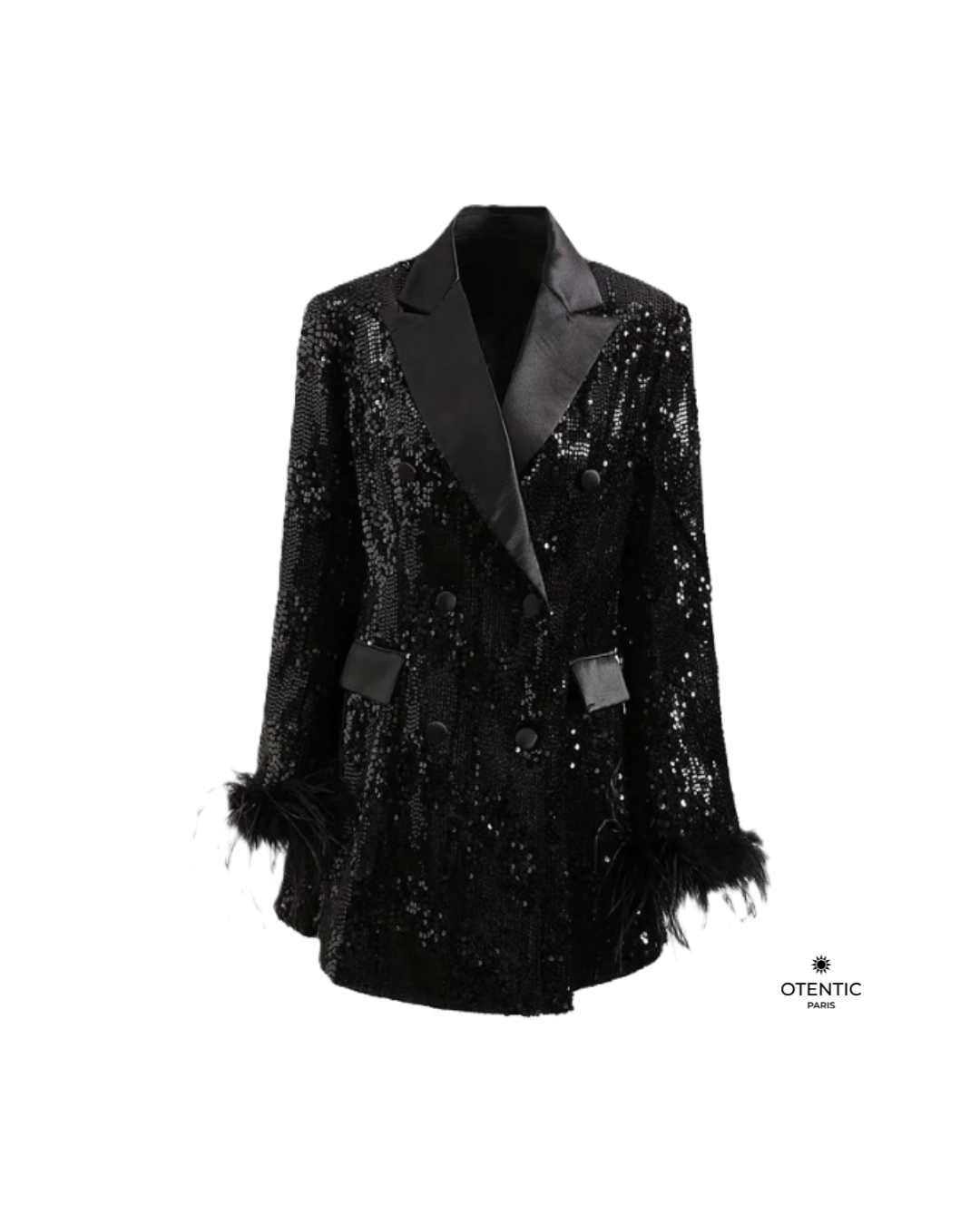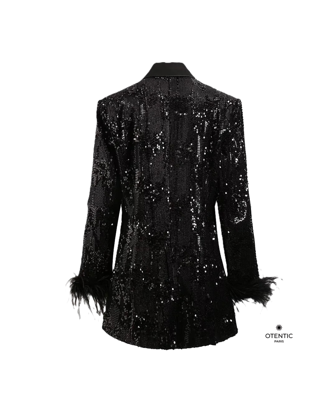 • Finition à plumes brillantes sur le bas de la veste