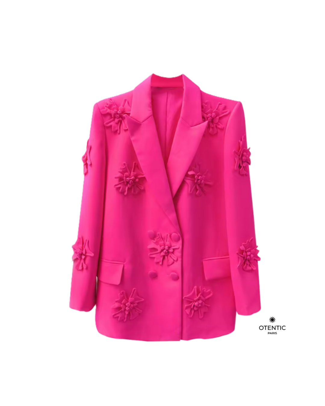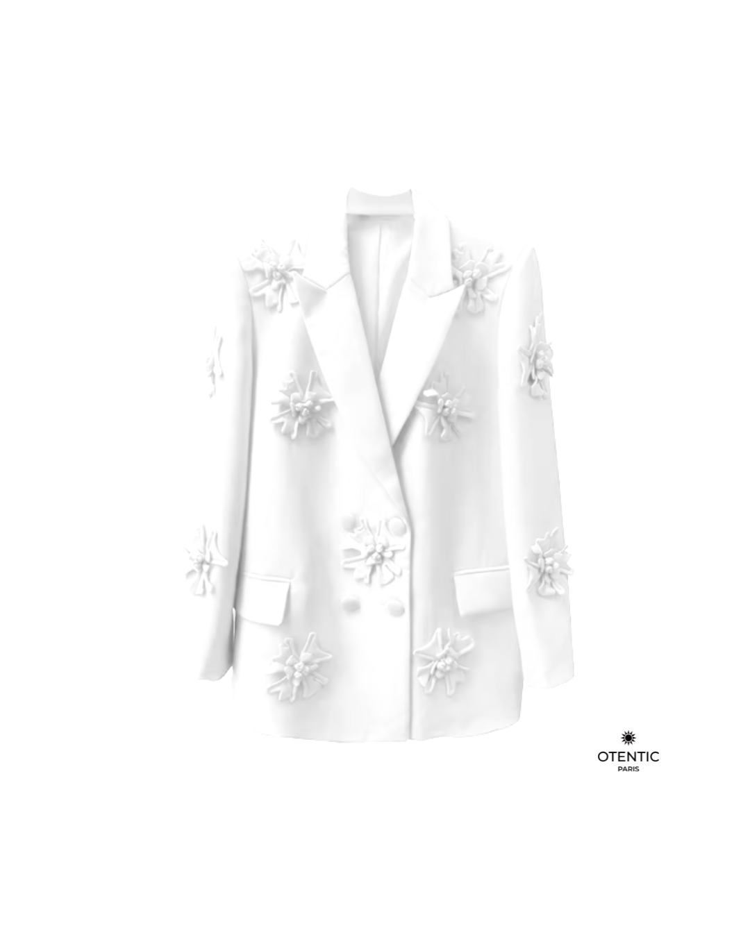 Cette veste au design sculptural fait sensation avec ses fleurs ton sur ton en relief. Son volume légèrement oversize et son double boutonnage évoquent une allure couture audacieuse, tout en conservant une élégance contemporaine. Parfaite pour celles qui souhaitent affirmer leur style avec singularité et audace.