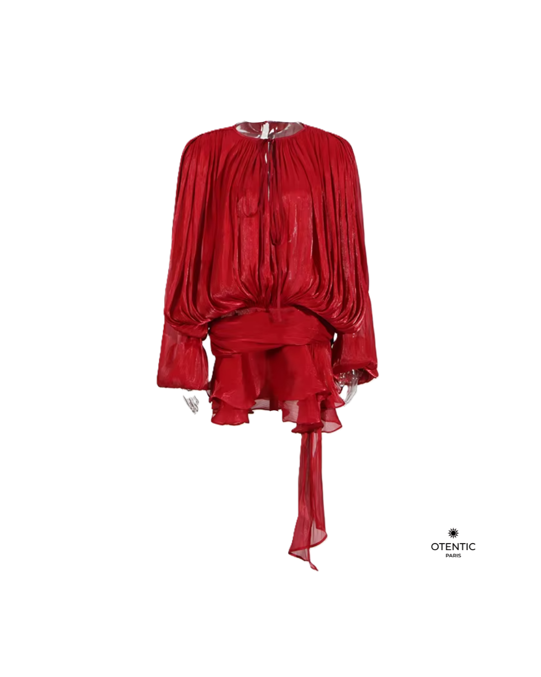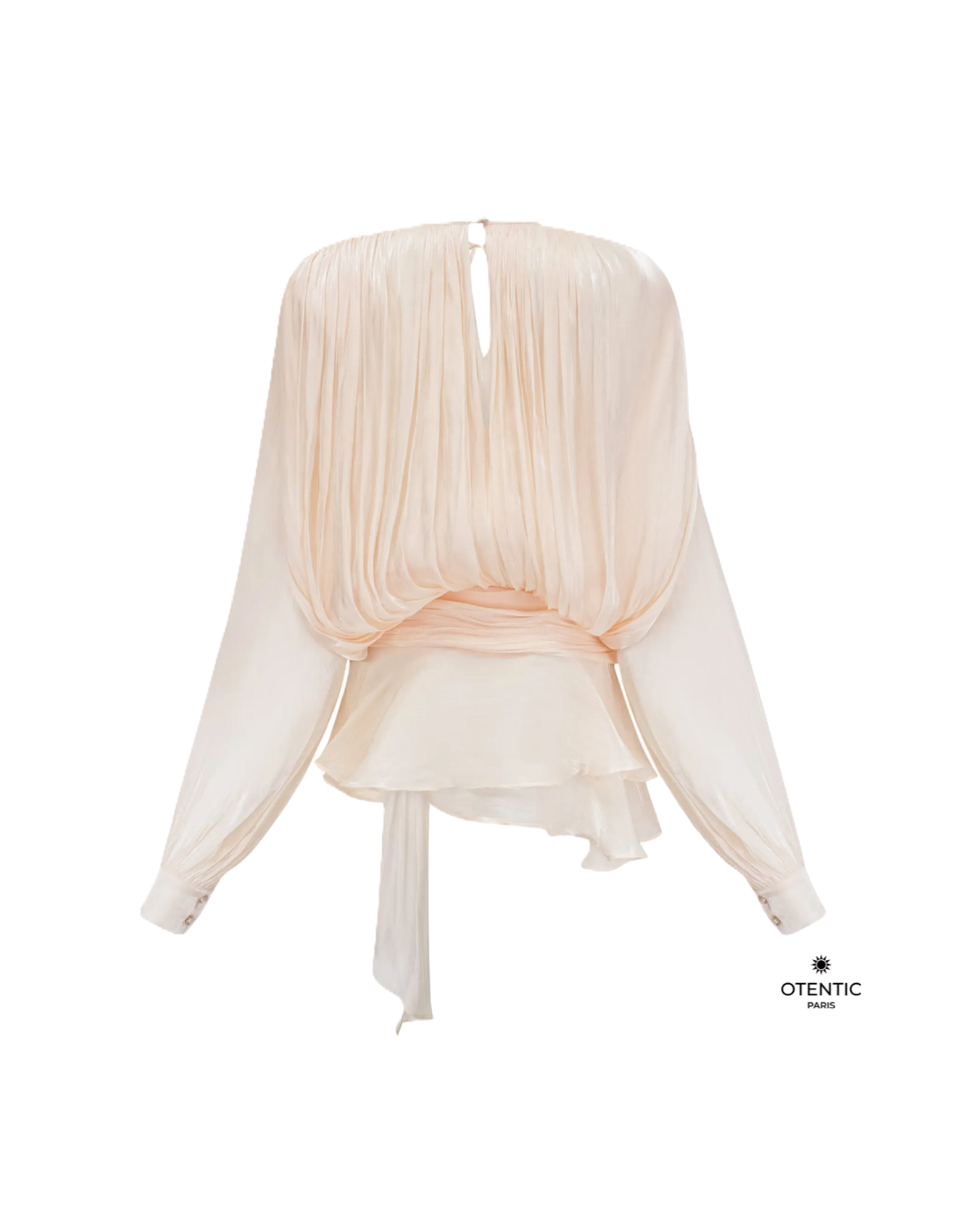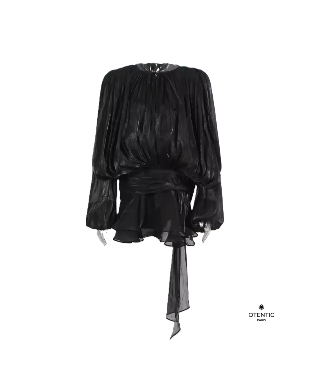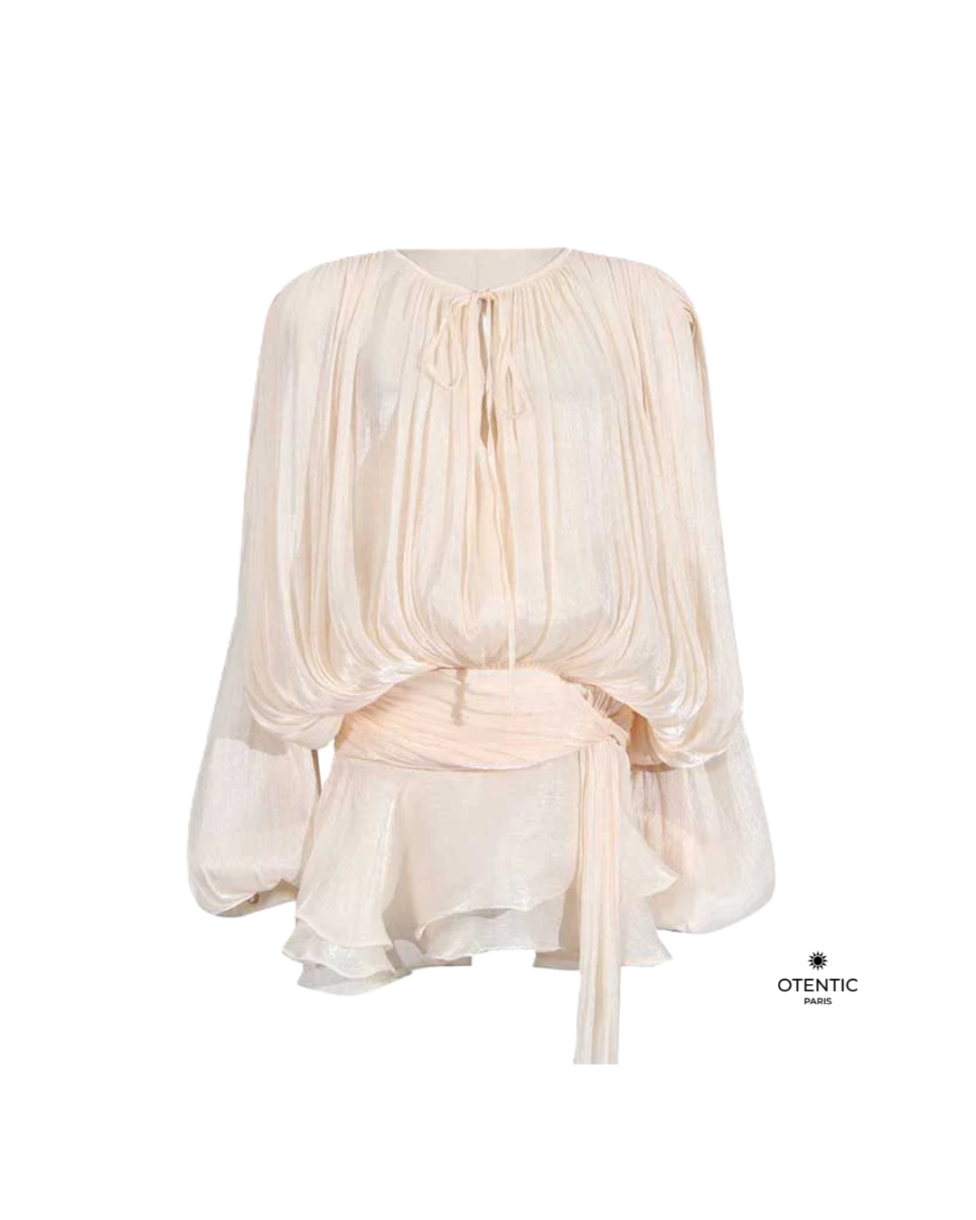 Cette blouse fluide à manches longues incarne l’élégance intemporelle. Confectionnée dans une mousseline de soie délicate, elle se distingue par ses jeux de drapés vaporeux, son encolure froncée et son lien à nouer à la taille. Le détail plissé crée un mouvement aérien, parfait pour une silhouette féminine et sophistiquée.