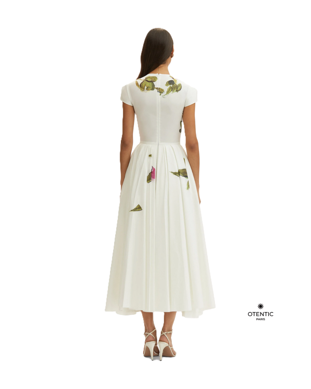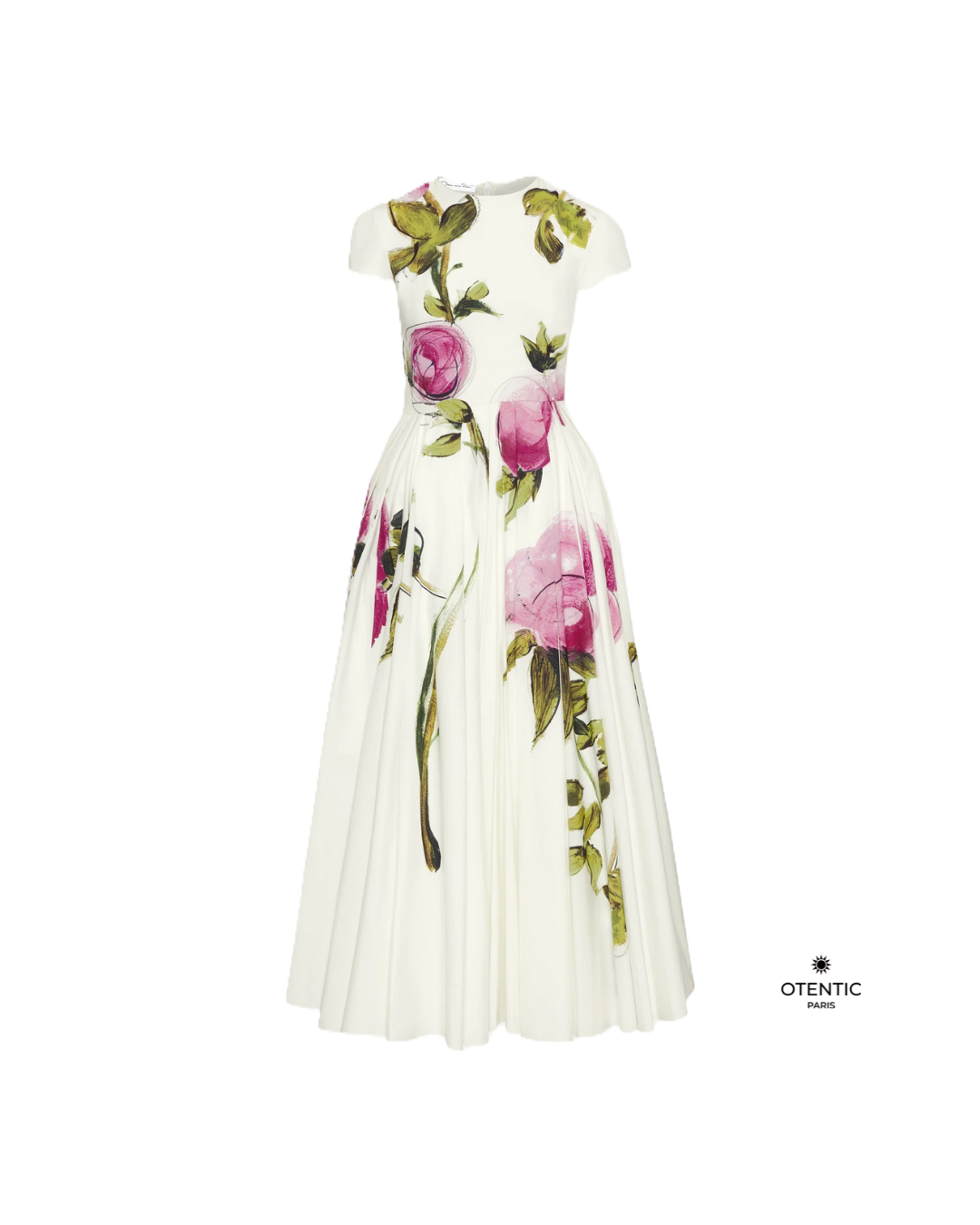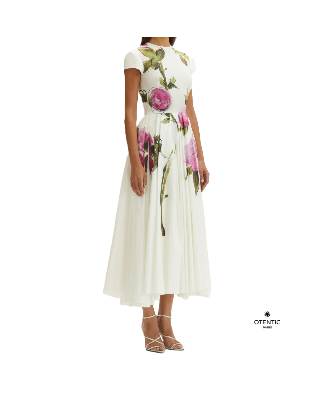 Robe midi élégante en popeline blanche, ornée d’un imprimé floral à grandes roses fuchsia et feuillage vert. Une pièce maîtresse qui incarne le romantisme parisien et l’élégance intemporelle.